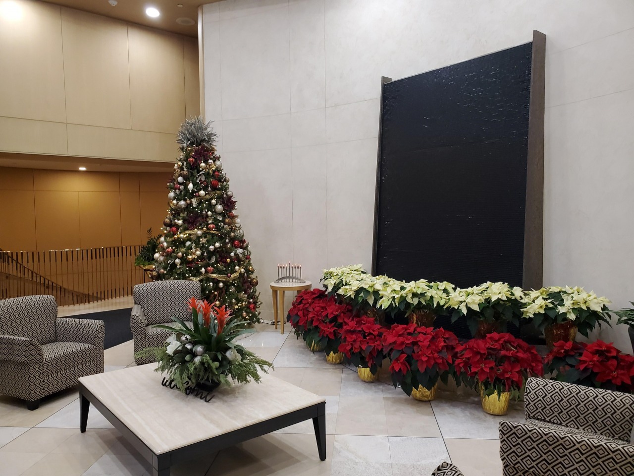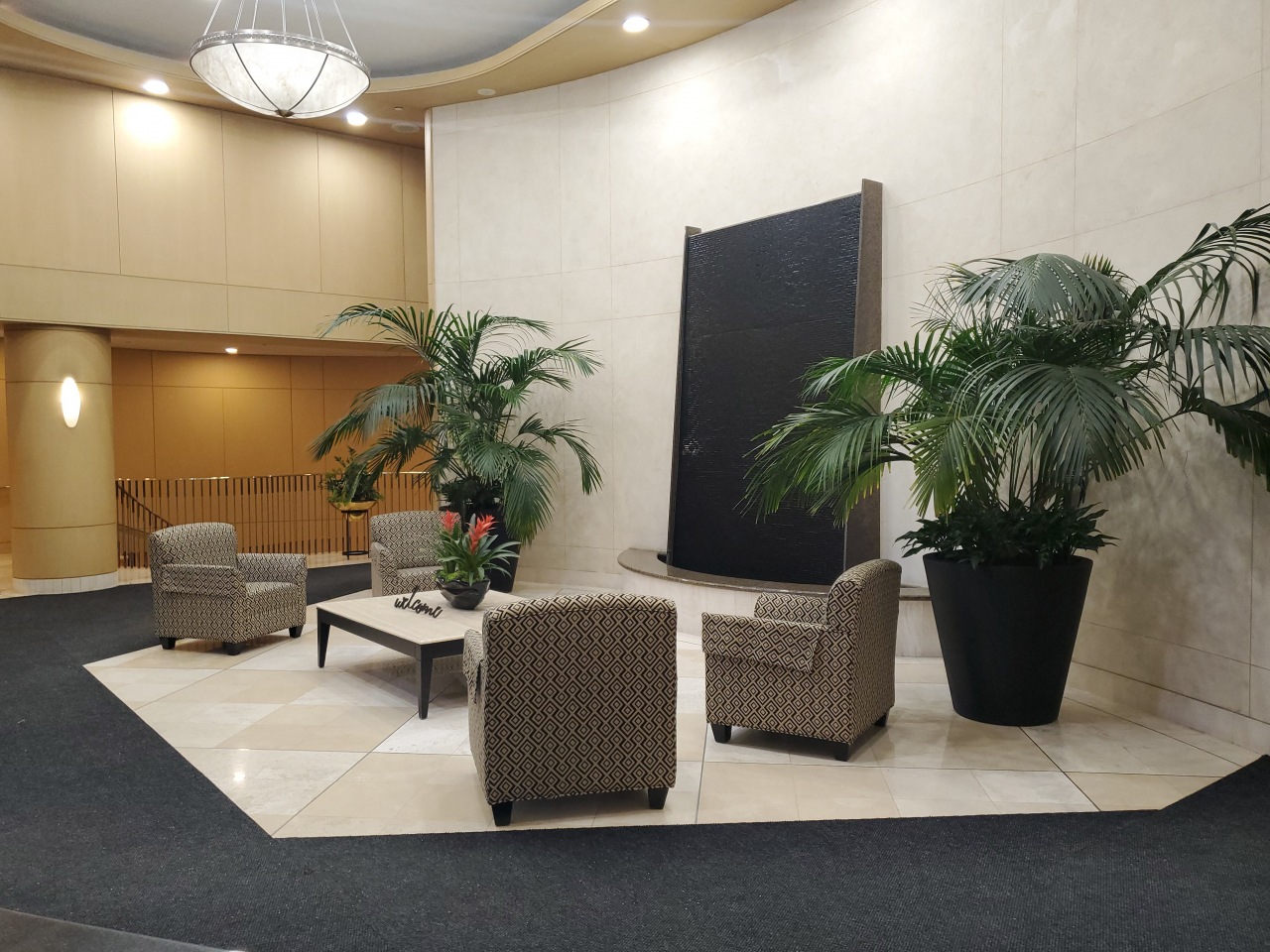 The stunning 18 story residence with stylish balconies and terraces also has a grand two story lobby with water feature.
