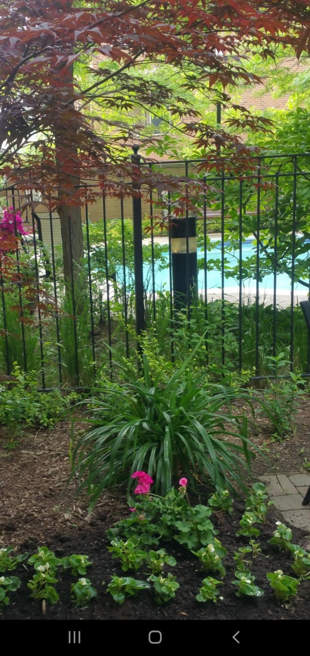 A lush outdoor garden surrounds the BBQ and patio area of the in-ground pool.
